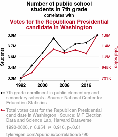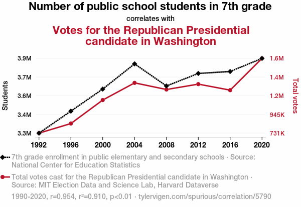 This means 91% of the change in the one variable (i.e., Votes for the Republican Presidential candidate in Washington) is predictable based on the change in the other (i.e., Number of public school students in 7th grade) over the 8 years from 1990 through 2020.