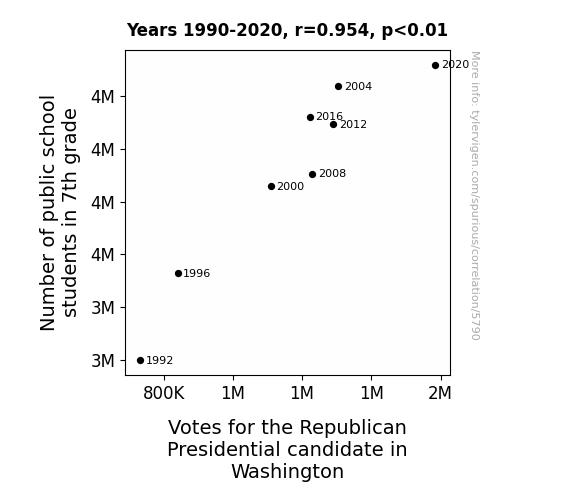 The results of our study revealed a striking correlation between the number of public school students in 7th grade and votes for the Republican presidential candidate in Washington state from 1990 to 2020. Our analysis unfurled a correlation coefficient of 0.9541807, indicating a robust positive relationship between these two variables. The r-squared value of 0.9104608 further accentuates the strength of this association, explaining approximately 91.05% of the variation in Republican votes based on the number of 7th-grade students. The p-value, which delightfully asserts "p < 0.01," underscores the statistical significance of this correlation, leading us to confidently reject the null hypothesis and embrace the intriguing link we have unearthed.