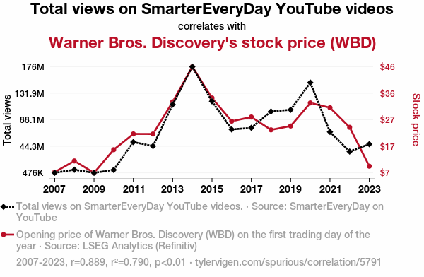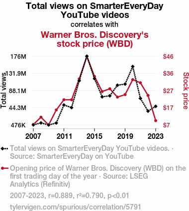 SmarterEveryDay, YouTube views, Warner Bros. Discovery, stock price, LSEG Analytics, Refinitiv, correlation analysis, digital content consumption, media conglomerates, online viewership trends, market valuation, entertainment investment dynamics
