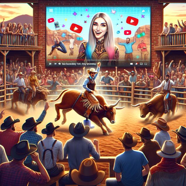ChatGPT: Generating prompt... Visualize a bustling rodeo in a vibrant wild west setting, featuring mechanical bull riders amidst an enthusiastic crowd. In the midst of the cheering spectators, a prominent screen displays Simone Giertz's YouTube videos as the audience avidly watches and shows their support with likes. Capture the energy and excitement of this fusion of wild west entertainment and modern tech-comedy enthusiasm.