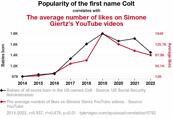 User prompt: Please provide potential search keywords for a paper titled Colt and Giertz: The Likable Link? with an abstract of In this study, we set out to investigate the surprising connection between the popularity of the first name "Colt" and the average number of likes on Simone Giertz's YouTube videos. Drawing data from the US Social Security Administration for the frequency of the name "Colt" and from YouTube for the likes on Giertz's videos, our research team embarked on a quest to uncover the correlation between these seemingly unrelated entities. With puns as our sidekicks and statistical tools as our weapons, we braved the wilds of data analysis to seek the elusive connection.