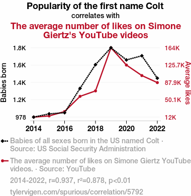 This means 87.8% of the change in the one variable (i.e., The average number of likes on Simone Giertz's YouTube videos) is predictable based on the change in the other (i.e., Popularity of the first name Colt) over the 9 years from 2014 through 2022.