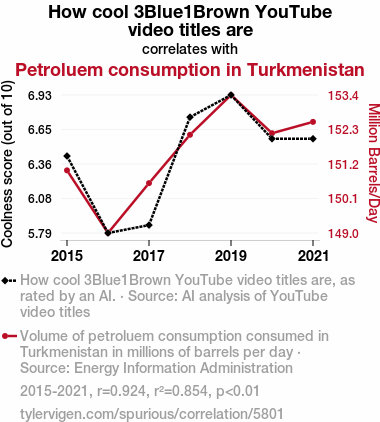 User prompt: Please provide potential search keywords for a paper titled From Calc to Crude: A Correlation Between 3Blue1Brown Video Titles and Petroleum Consumption in Turkmenistan with an abstract of This study investigates the unexpected and seemingly arcane relationship between 3Blue1Brown YouTube video titles and petroleum consumption in Turkmenistan. Using data from AI analysis of video titles from Grant Sanderson's popular channel and Petroleum Consumption statistics from the Energy Information Administration, we explored the potential impact of visually stimulating math explanations on a country's demand for crude oil. The findings reveal a surprisingly strong correlation between the coolness of 3Blue1Brown video titles and petroleum consumption in Turkmenistan, with a correlation coefficient of 0.9243418 and p < 0.01 for the period spanning from 2015 to 2021.