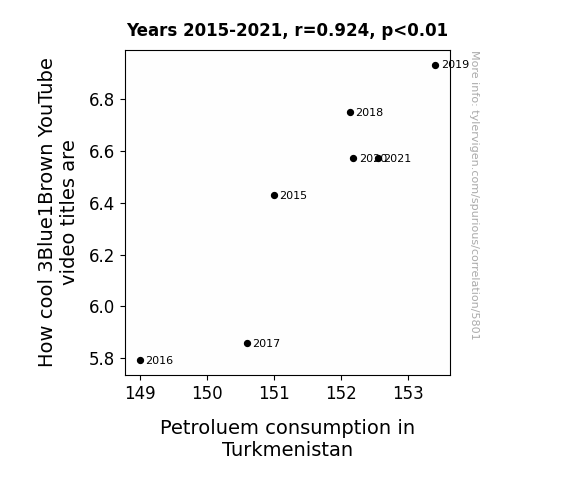 This means 85.4% of the change in the one variable (i.e., Petroluem consumption in Turkmenistan) is predictable based on the change in the other (i.e., How cool 3Blue1Brown YouTube video titles are) over the 7 years from 2015 through 2021.