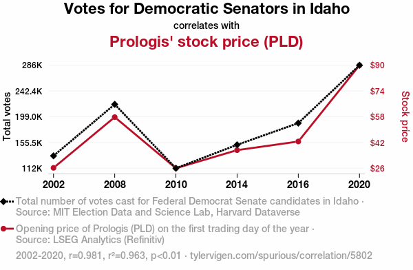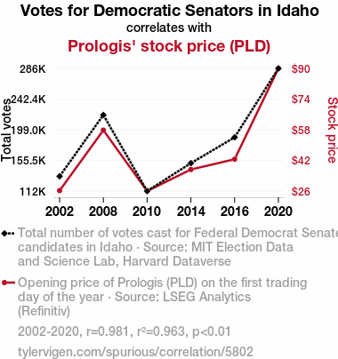 - The spurious research paper: Blue State Blues and Real Estate Views: The Impact of Democratic Senatorial Votes in Idaho on Prologis' Stock Price (PLD)