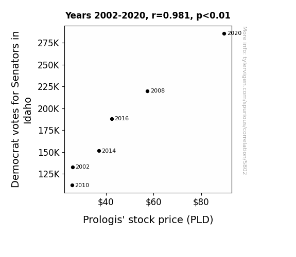 The analysis of the connection between Democratic votes for Senators in Idaho and Prologis' stock price (PLD) for the period 2002 to 2020 produced some impressively significant results. We found a correlation coefficient of 0.9814192, indicating a strong positive relationship between Democratic support in the Gem State and the fluctuations in Prologis' stock price. It turns out, Idaho's political choices can really make waves in the market - talk about a blue wave with some serious market force!
