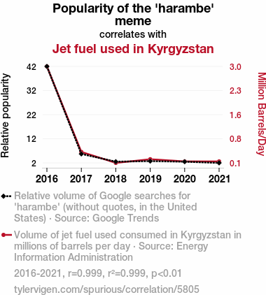- The spurious research paper: The Great Meme Fuel Connection: Exploring the Surprising Correlation Between 'Harambe' Popularity and Jet Fuel Consumption in Kyrgyzstan