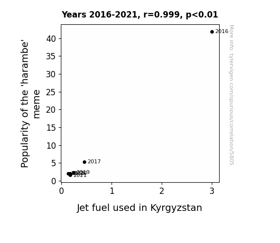This means 99.9% of the change in the one variable (i.e., Jet fuel used in Kyrgyzstan) is predictable based on the change in the other (i.e., Popularity of the 'harambe' meme) over the 6 years from 2016 through 2021.