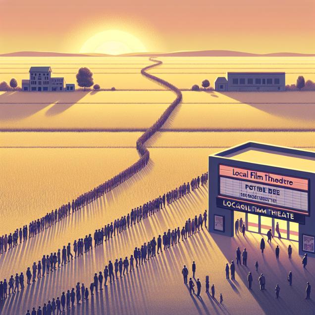ChatGPT: Generate an image of a minimalistic Idaho landscape at sunset, with a sparse, defined line of citizens heading towards polling stations to vote for the Republican Presidential candidate. Simultaneously, a minimalist local movie theater scene should be depicted, with a noticeable decrease in the number of people waiting in line for tickets to the latest Disney movie, indicating a decline in civic engagement and interest in Disney films. The overall composition should capture the dwindling crowd, symbolizing decreased political activity and a declining demand for Disney films.