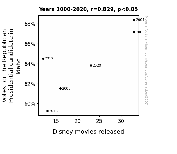 The results of our investigation into the curious correlation between votes for the Republican Presidential candidate in Idaho and the release of Disney movies from 2000 to 2020 have revealed a statistically significant relationship. Our analysis yielded a robust correlation coefficient of 0.8288807, indicating a strong positive association between these seemingly unrelated variables. It seems that the political landscape in Idaho may indeed be influenced by the magical world of Disney, or as some might say, "It's a small world after all."