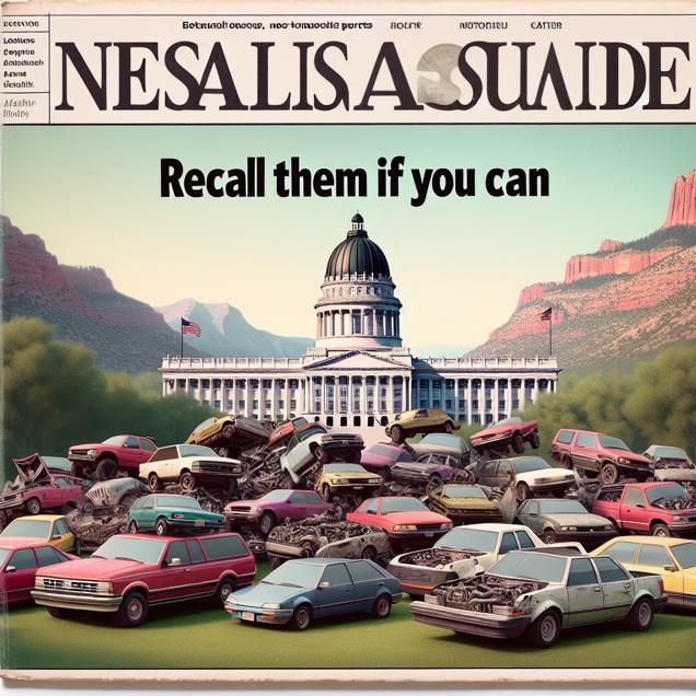 ChatGPT: Prompt: Generate an image reminiscent of a TIME magazine cover depicting a Utah landscape with a backdrop of the state Capitol building. In the foreground, illustrate a cluster of Honda cars with exaggerated and whimsical features, reflecting the "recall them if you can" approach. Show the cars with loose or missing parts, comically oversized engines, and humorous modifications, symbolizing the surge in automotive recalls amid the state's embrace of newfound freedom and libertarian influence. Capture the collision of political and automotive realms in a visually engaging and thought-provoking composition.