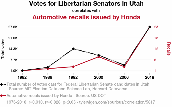 libertarian votes Utah, Honda recalls correlation, politics automotive industry, Libertarian party Utah, correlation coefficient political voting, US Senate elections Utah, Honda automotive recalls, MIT Election Data and Science Lab, Harvard Dataverse, US DOT data analysis