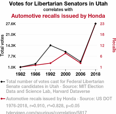 User prompt: Please provide potential search keywords for a paper titled Liberty in the Garage: A Quirky Connection Between Libertarian Votes in Utah and Honda Recalls with an abstract of In a whimsical exploration of seemingly unrelated phenomena, this study delves into the intriguing relationship between the number of Libertarian votes for Senators in Utah and the occurrence of automotive recalls issued by Honda. Using data gathered from the MIT Election Data and Science Lab, Harvard Dataverse, and US DOT, our research team conducted a thorough analysis from 1976 to 2018. Surprisingly, a strong correlation coefficient of 0.9096964 was found, with a p-value of less than 0.05, suggesting a statistically significant relationship between these two variables. While causation cannot be inferred from this correlation, the findings of this research serve as a reminder that hidden connections may exist in the most unexpected places – even between politics and car troubles. This study aims to shed light on this whimsical link and contribute to the growing body of interdisciplinary research, leaving readers with both laughter and food for thought.
