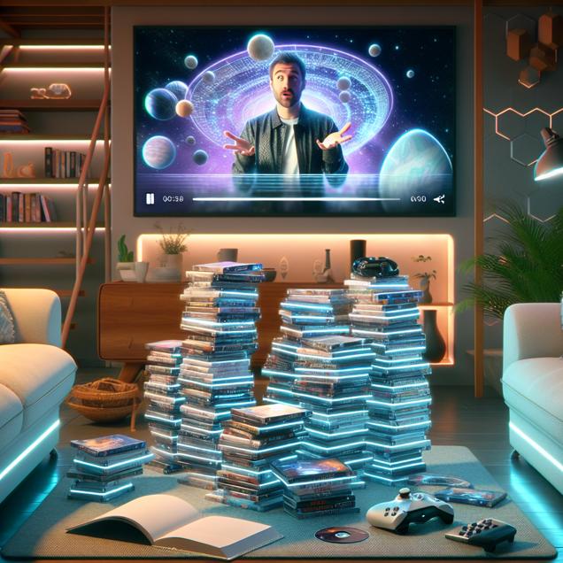 ChatGPT: In a cozy living room, a stack of Mila Kunis movie DVDs keeps growing on the coffee table as a nerdy Tom Scott YouTube video plays in the background, competing for attention with the increasing number of films. The number of DVDs piles higher as Tom Scott's videos intermittently catch the eye of the viewer, reflecting the dilemma of balancing the increasing movie list with the desire to watch informative and entertaining videos.