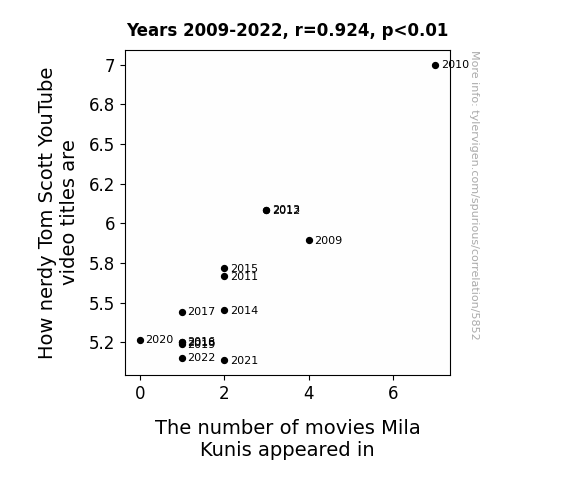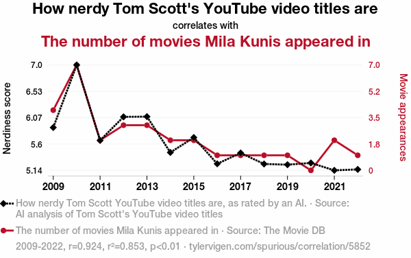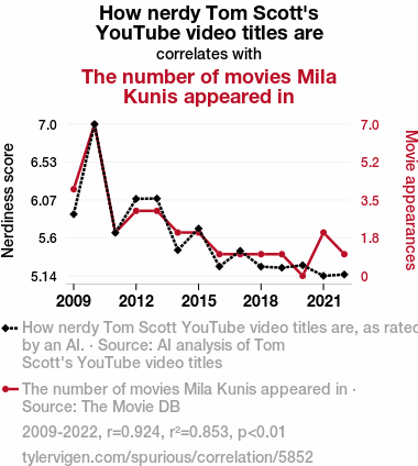 A linear line chart with years as the X-axis and two variables on the Y-axis. The first variable is How nerdy Tom Scott's YouTube video titles are and the second variable is The number of movies Mila Kunis appeared in.  The chart goes from 2009 to 2022, and the two variables track closely in value over that time. Small Image