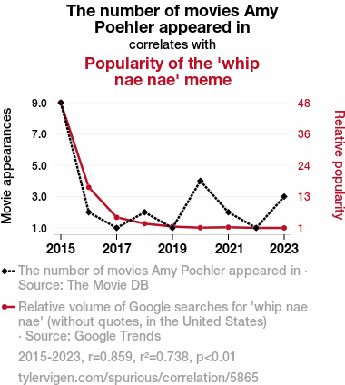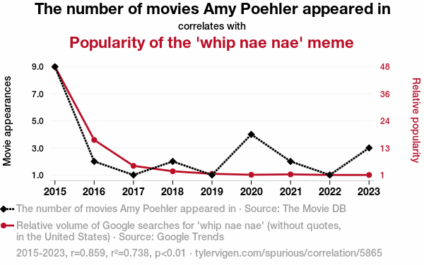This means 73.8% of the change in the one variable (i.e., Popularity of the 'whip nae nae' meme) is predictable based on the change in the other (i.e., The number of movies Amy Poehler appeared in) over the 9 years from 2015 through 2023.