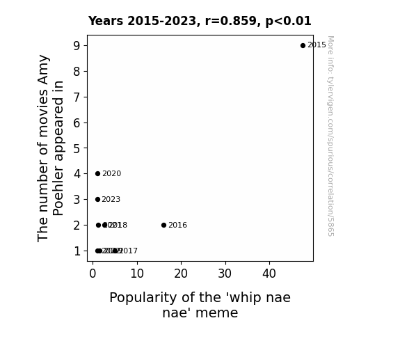 But as we bid adieu to this zany adventure, we assert with unwavering certainty that no further research is needed in this realm. The connection between the number of movies Amy Poehler appears in and the surge in popularity of the 'whip nae nae' meme is as solid as a petrified p-value. So, let's hang up our data-driven dancing shoes and savor this moment of statistical harmony, for in the colorful tapestry of research, sometimes the most serendipitous connections sway their way to center stage. And trust us, in this case, it's been a statistical ball.