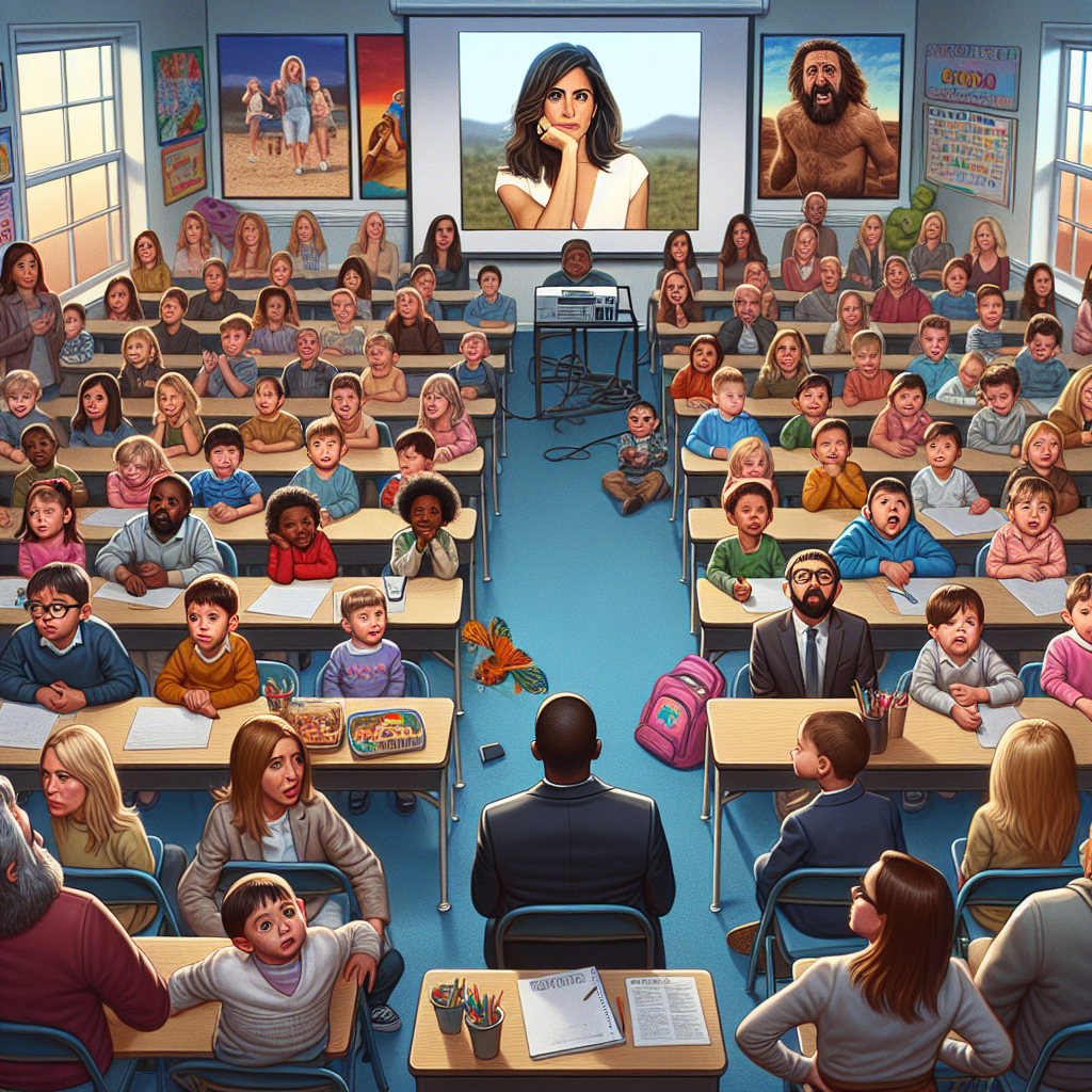 Prompt: Generate an image of Ellen Page's movies playing on a large screen in a classroom, surrounded by preschool special education teachers from Texas. As the teachers watch, their faces express disappointment and concern, and they take notes as they learn. The group of teachers slowly diminishes as Ellen Page's movie career slows down, leaving fewer teachers to guide the children, who are seen eagerly learning and playing in the background. Capture the poignant contrast between the changing teacher-student ratio and the children's innocent enthusiasm. The depiction should include only scenes, people, and objects, it should not include text or speech bubbles.