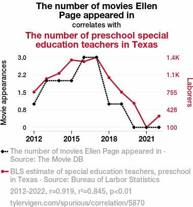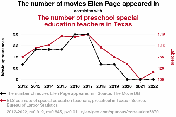 User prompt: Please provide potential search keywords for a paper titled The Ellen Page Effect: A Cinematic Conundrum or Statistical Serendipity? with an abstract of This paper investigates the curious connection between the number of movies featuring actress Ellen Page and the count of preschool special education teachers in the vast educational landscape of Texas. Leveraging the comprehensive dataset from The Movie DB and the Bureau of Labor Statistics, we rigorously examined the association between these seemingly disparate entities. Our analysis reveals a staggering correlation coefficient of 0.9194990 and a significance level of p < 0.01 for the period spanning from 2012 to 2022. The implications of this unexpected correlation are both baffling and intriguing, raising questions about causal links, underlying mechanisms, and potential implications for social and economic phenomena. The findings, albeit unanticipated, underscore the need for further exploration into the peculiar interplay of cinematic trends and workforce dynamics.
