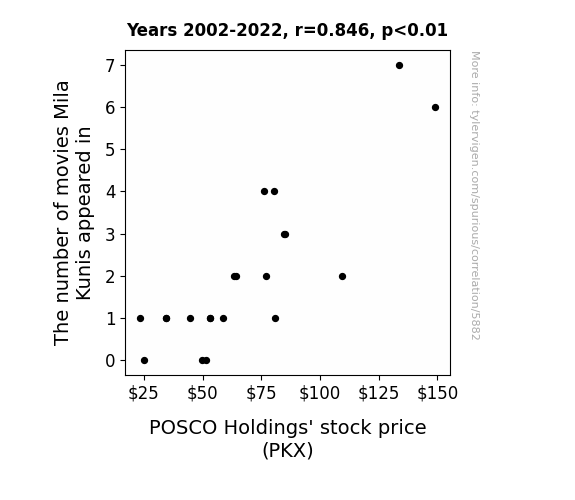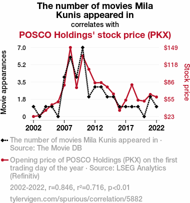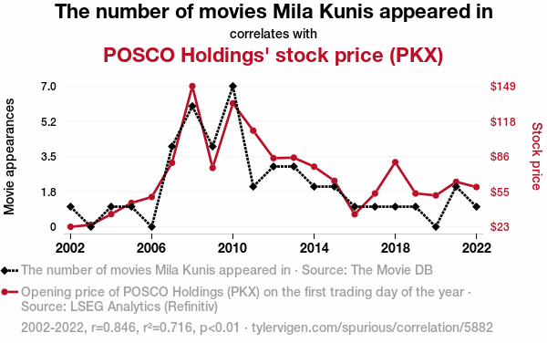 This study sets out to investigate the potential link between the number of movies featuring actress Mila Kunis and the stock price of POSCO Holdings (PKX). Leveraging data from The Movie DB and LSEG Analytics (Refinitiv), a time series analysis covering the period from 2002 to 2022 was conducted. The study revealed a striking correlation coefficient of 0.8461507 and a statistically significant p-value of less than 0.01, indicating a strong relationship between the two variables.
