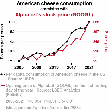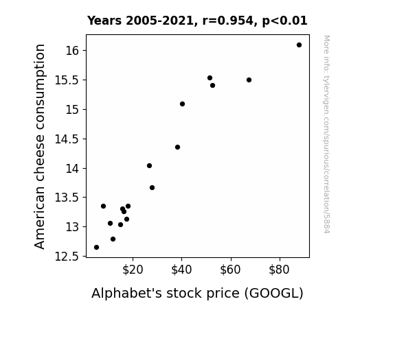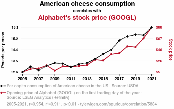 A linear line chart with years as the X-axis and two variables on the Y-axis. The first variable is American cheese consumption and the second variable is Alphabet's stock price (GOOGL).  The chart goes from 2005 to 2021, and the two variables track closely in value over that time. Small Image