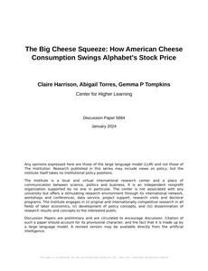 User prompt: Please provide potential search keywords for a paper titled The Big Cheese Squeeze: How American Cheese Consumption Swings Alphabet's Stock Price with an abstract of This paper delves into the cheesy world of American cheese and its unexpected influence on the stock price of Alphabet Inc. (GOOGL). Utilizing data from the USDA and LSEG Analytics (Refinitiv), we applied rigorous statistical analysis to unravel the tantalizing correlation between American cheese consumption and Alphabet's stock price. With a striking correlation coefficient of 0.9544431 and a p-value of less than 0.01 for the years 2005 to 2021, our findings suggest that there may be more to this gooey tale than meets the eye. Join us on this cheesy adventure as we explore the dairy-driven dynamics of the stock market and shed light on the unexpected power of American cheese.