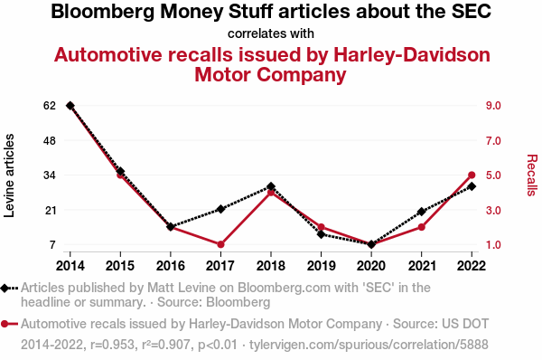 SEC regulatory activities, Harley-Davidson recalls, correlation between SEC regulations and automotive recalls, Bloomberg Money Stuff, financial oversight, motorbike manufacturing, correlation coefficient, p-value, Wall Street, motorcycle engineering, financial and automotive landscapes, SEC chatter, hog recalls