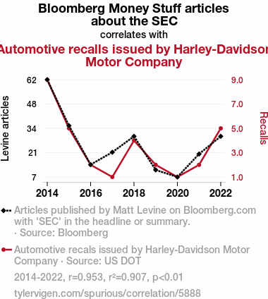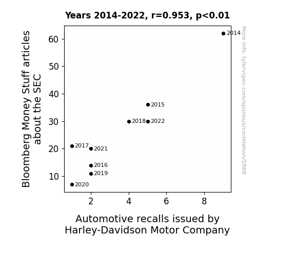 This means 90.7% of the change in the one variable (i.e., Automotive recalls issued by Harley-Davidson Motor Company) is predictable based on the change in the other (i.e., Bloomberg Money Stuff articles about the SEC) over the 9 years from 2014 through 2022.
