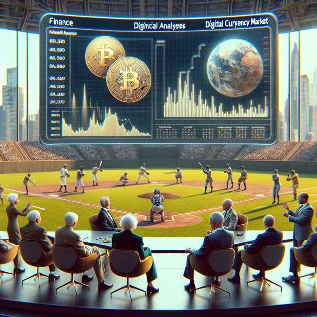 User prompt: Please describe a visual scene that prominently depicts both Bloomberg Money Stuff articles about bitcoin and The average age of batters for the Los Angeles Angels, in the following situation: As the coverage of Bitcoin in Bloomberg Money Stuff grew, more and more people started to feel like they were in the big leagues of finance. This newfound sense of financial prowess led to an increased interest in baseball, particularly among older individuals seeking a new hobby after retirement. The Los Angeles Angels, being a prominent team, became the top choice for these new, financially savvy fans. As a result, there was a sudden surge in older individuals trying out for the team, ultimately raising the average age of batters. It seems like Bitcoin wasn't just a home run in the world of finance, but also inadvertently pitched in to the age demographics of a professional baseball team!. Keep the description simple.