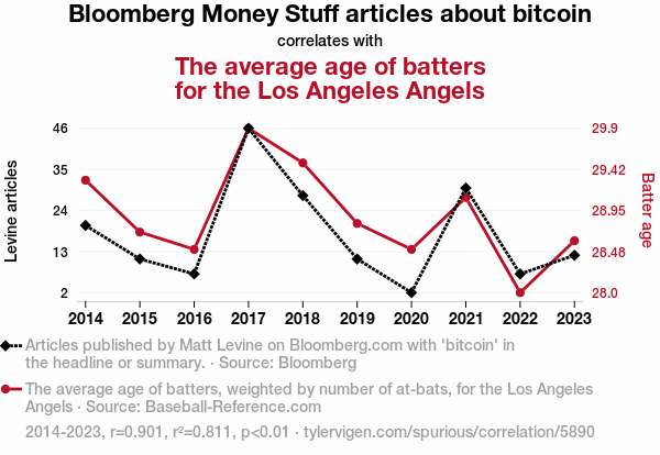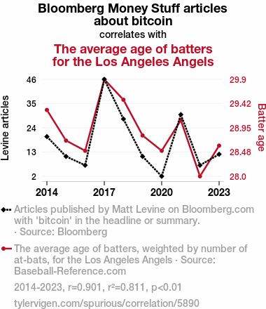 A linear line chart with years as the X-axis and two variables on the Y-axis. The first variable is Bloomberg Money Stuff articles about bitcoin and the second variable is The average age of batters for the Los Angeles Angels.  The chart goes from 2014 to 2023, and the two variables track closely in value over that time. Small Image