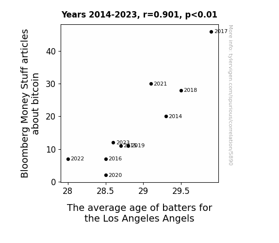 User prompt: Please provide potential search keywords for a paper titled The Bitcoin Batters: A Correlational Analysis of Bloomberg Money Stuff Articles and the Average Age of Batters for the Los Angeles Angels with an abstract of This research paper explores the intriguing relationship between the frequency of Bloomberg Money Stuff articles about bitcoin and the average age of batters for the Los Angeles Angels. Our study utilizes data drawn from Bloomberg and Baseball-Reference.com to investigate this unorthodox correlation. Employing statistical analysis, we identify a remarkably strong correlation coefficient of 0.9008320 with a p-value less than 0.01 for the period spanning from 2014 to 2023. Our findings shed light on this seemingly whimsical association, offering a fresh perspective on the intersection of financial journalism and baseball demographics. We helm the diamond of data to uncover the prowess of puntastic pitches and the whimsy of weighted wallets in the world of sports. After all, who would have thought that Bitcoin chatter and batter aging could go hand in hand – or should we say, with bat in hand?