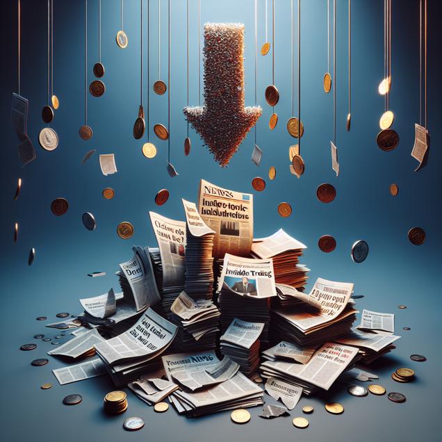 Prompt: Create an image that resembles a TIME magazine cover, with a diminishing stack of Bloomberg Money Stuff articles on insider trading and a downward arrow depicting Banco Bilbao Vizcaya Argentaria's (BBVA) stock price. Use visual cues that convey suspicion and uncertainty, as well as a decrease in investor confidence in the bank's transparency. Keep the image visually striking but simple, without the inclusion of any words or speech bubbles. The depiction should include only scenes, people, and objects, it should not include text or speech bubbles.