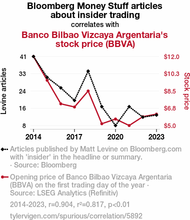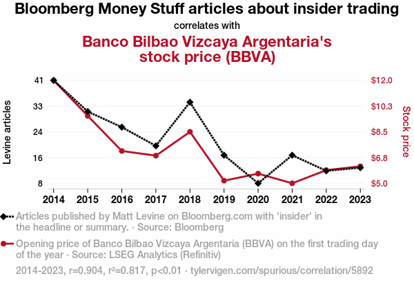 "Money Stuff" articles, Bloomberg insider trading, Banco Bilbao Vizcaya Argentaria stock price, financial analysis, stock market correlation, Levine's articles, LSEG Analytics, insider trading humor, stock price movements, stock market sense of humor