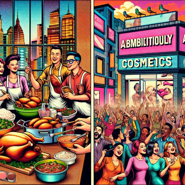 Prompt: Generate a vibrant pop art-inspired image of a family joyfully bustling around a cozy kitchen, together preparing a sumptuous poultry feast. Surround them with various fancy chicken options, with vivid, exaggerated colors to emphasize the excitement and joy of the culinary process. Concurrently, depict a bustling street scene outside, capturing the delight of a crowd of people walking into an Ulta store. The image should express the vibrant energy of the poultry feast and the glamour of the beauty store, creating an intriguing correlation between poultry spending and Ulta's stock price. The depiction should include only scenes, people, and objects, it should not include text or speech bubbles.