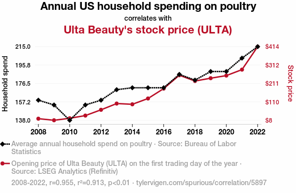- The spurious research paper: Feathers and Botox: A Statistical Affair Between Poultry Spending and ULTA Stock Price