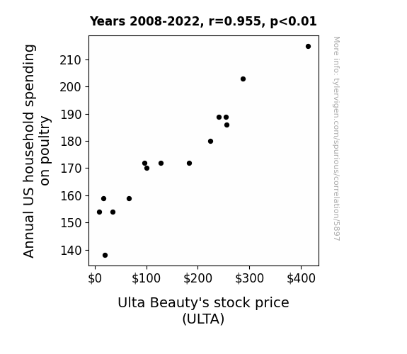 This paper investigates the unexpected relationship between annual US household spending on poultry and ULTA Beauty's stock price (ULTA) using data from the Bureau of Labor Statistics and LSEG Analytics (Refinitiv). Our thorough analysis reveals a striking correlation coefficient of 0.9554214 and p < 0.01 for the years 2008 to 2022, suggesting a strong link between these seemingly unrelated variables.