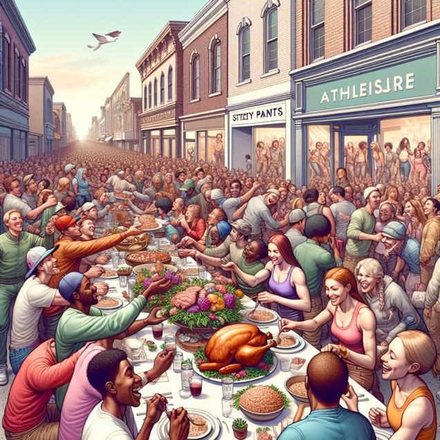 ChatGPT: Generate an image of a bustling neighborhood scene with a hyper-realistic representation of a family joyfully gathered around a dinner table, savoring a succulent pork roast. The surrounding environment should convey a sense of liveliness and prosperity, with people happily lining up outside a Lululemon store in the same neighborhood, eagerly purchasing stretchy pants. Both the increase in pork consumption and the demand for Lululemon reflect the thriving economy and rising stock price. Capture the harmonious coexistence of these two scenes to depict a visual correlation between rising pork spending and the success of Lululemon.