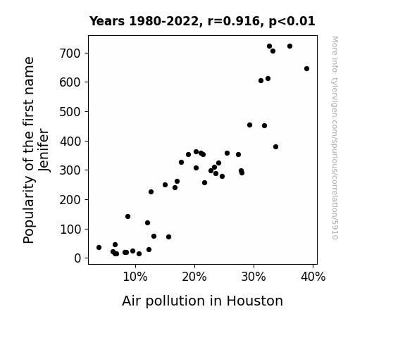 This means 83.8% of the change in the one variable (i.e., Air pollution in Houston) is predictable based on the change in the other (i.e., Popularity of the first name Jenifer) over the 43 years from 1980 through 2022.