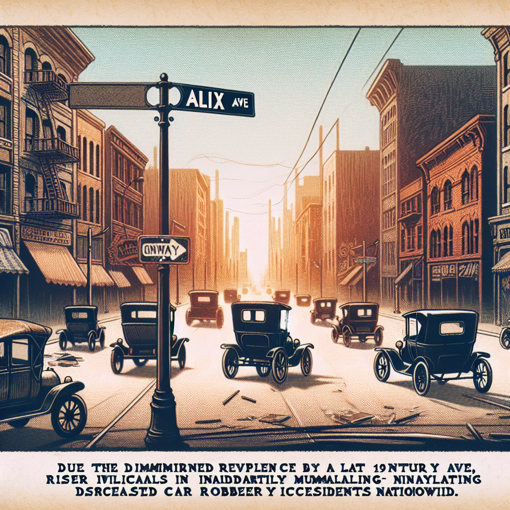 ChatGPT: In a bustling city, a street sign with "Alix Ave" stood surrounded by parked cars. Fewer people walked by, and the street was less crowded. The decrease in popularity of the name Alix meant fewer people were inadvertently summoning cars with their presence, resulting in a decrease in opportunities for carjackings across the country.