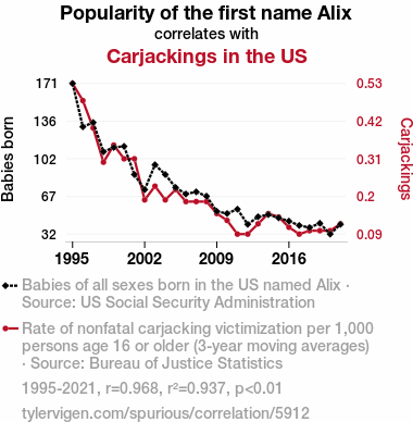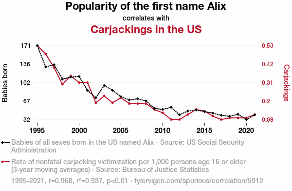 A linear line chart with years as the X-axis and two variables on the Y-axis. The first variable is Popularity of the first name Alix and the second variable is Carjackings in the US.  The chart goes from 1995 to 2021, and the two variables track closely in value over that time. Small Image