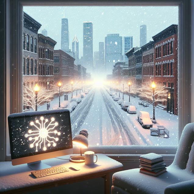 User prompt: Please respond with an image generation prompt that would be likely to create an interesting visual using DALLE-3, using the following style: [ Snowfall in Chicago: Realistic ] and depicting this scene: Picture a tranquil, snow-covered street in Chicago, with the city skyline in the background. Amidst the winter wonderland, a computer screen is visible through a cozy window, displaying a series of brilliant and insightful OverSimplified YouTube video titles. The titles shimmer softly, as each snowflake seems to illuminate a new layer of historical insight, creating a blizzard of brilliance. Keep the visual depiction simple. Do not include any words or speech bubbles.