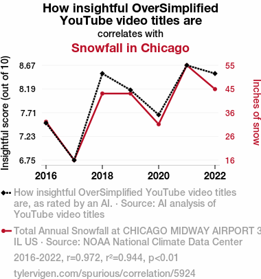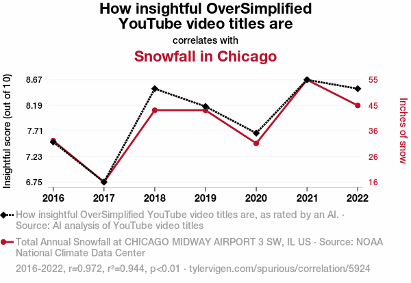 This means 94.4% of the change in the one variable (i.e., Snowfall in Chicago) is predictable based on the change in the other (i.e., How insightful OverSimplified YouTube video titles are) over the 7 years from 2016 through 2022.