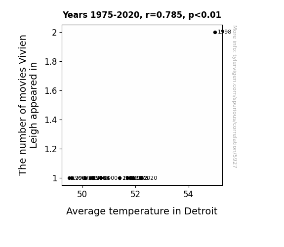 This means 61.6% of the change in the one variable (i.e., Average temperature in Detroit) is predictable based on the change in the other (i.e., The number of movies Vivien Leigh appeared in) over the 14 years from 1975 through 2020.