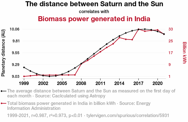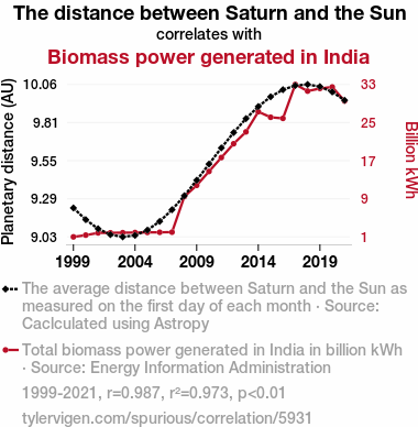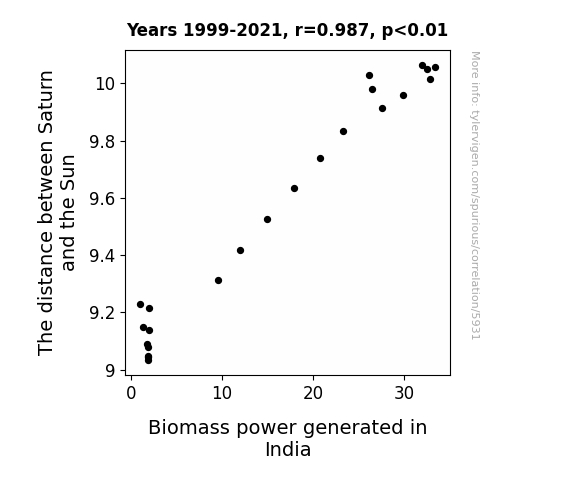 This means 97.3% of the change in the one variable (i.e., Biomass power generated in India) is predictable based on the change in the other (i.e., The distance between Saturn and the Sun) over the 23 years from 1999 through 2021.
