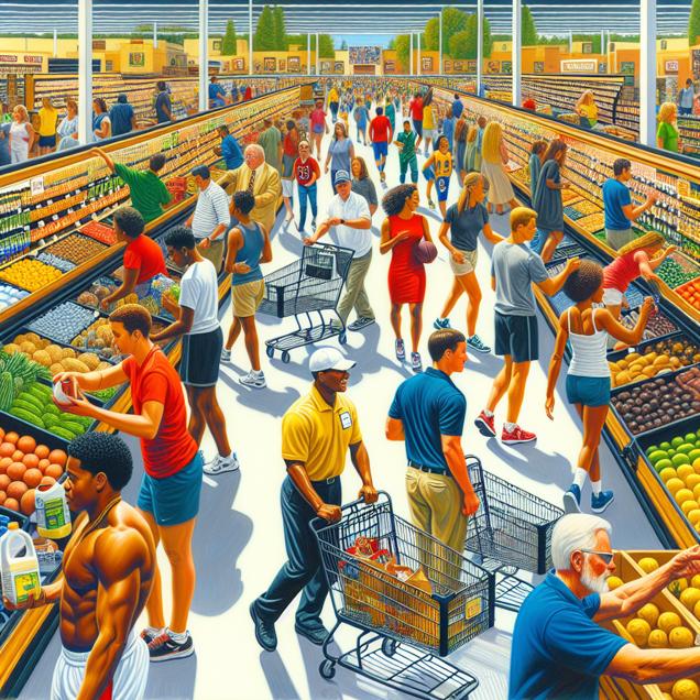 Prompt: Prompt: Generate an image that portrays a local Kroger store in North Carolina, vibrant with activity as shoppers navigate the bustling aisles. The cart-pushers move gracefully through the crowds, ensuring smooth movement. In the background, coaches and scouts are seen tirelessly supporting local athletes, adding to the seamless coordination and enhancing customer satisfaction at Kroger. The scene should exude the liveliness and positive energy of the store. The depiction should include only scenes, people, and objects, it should not include text or speech bubbles.