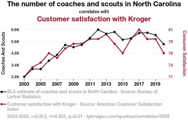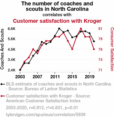 User prompt: Please make up a funny explanation for how an increase in The number of coaches and scouts in North Carolina caused Customer satisfaction with Kroger to increase.
