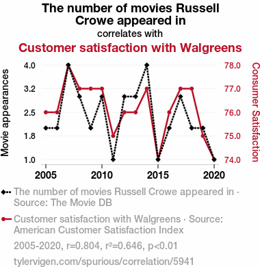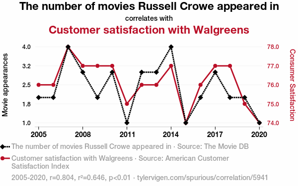 Russell Crowe, movies, filmography, Walgreens, customer satisfaction, correlation coefficient, statistical significance, The Movie DB, American Customer Satisfaction Index, 2005-2020, unconventional study, consumer sentiment, convenience store chain