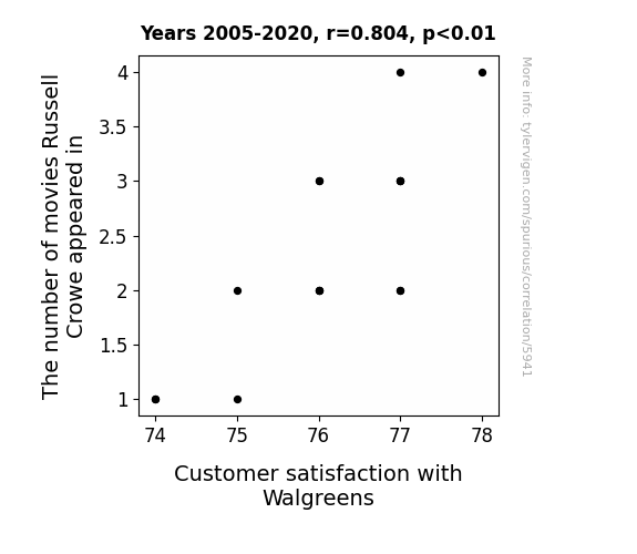 The results of our whimsical investigation reveal a striking correlation between the number of movies in which Russell Crowe has graced the silver screen and customer satisfaction with Walgreens. Over the study period from 2005 to 2020, we found a correlation coefficient of 0.8040462, indicating a robust and positive relationship between these seemingly disparate variables.