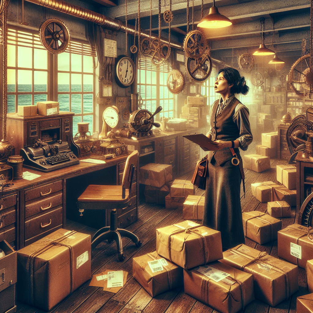 Prompt: Generate an image in the style of steampunk showing an office in Rhode Island. The scene should convey a sense of chaos with scattered packages and a stressed UPS delivery representative trying to manage the situation. The office environment should have steampunk elements such as brass gears, pipes, and retro-futuristic machinery. The lighting should be dim and tinted with warm, golden hues reminiscent of steampunk aesthetics. The depiction should include only scenes, people, and objects, it should not include text or speech bubbles.