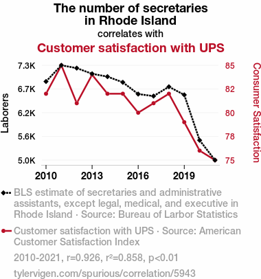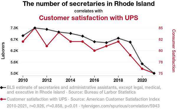 This means 85.8% of the change in the one variable (i.e., Customer satisfaction with UPS) is predictable based on the change in the other (i.e., The number of secretaries in Rhode Island) over the 12 years from 2010 through 2021.
